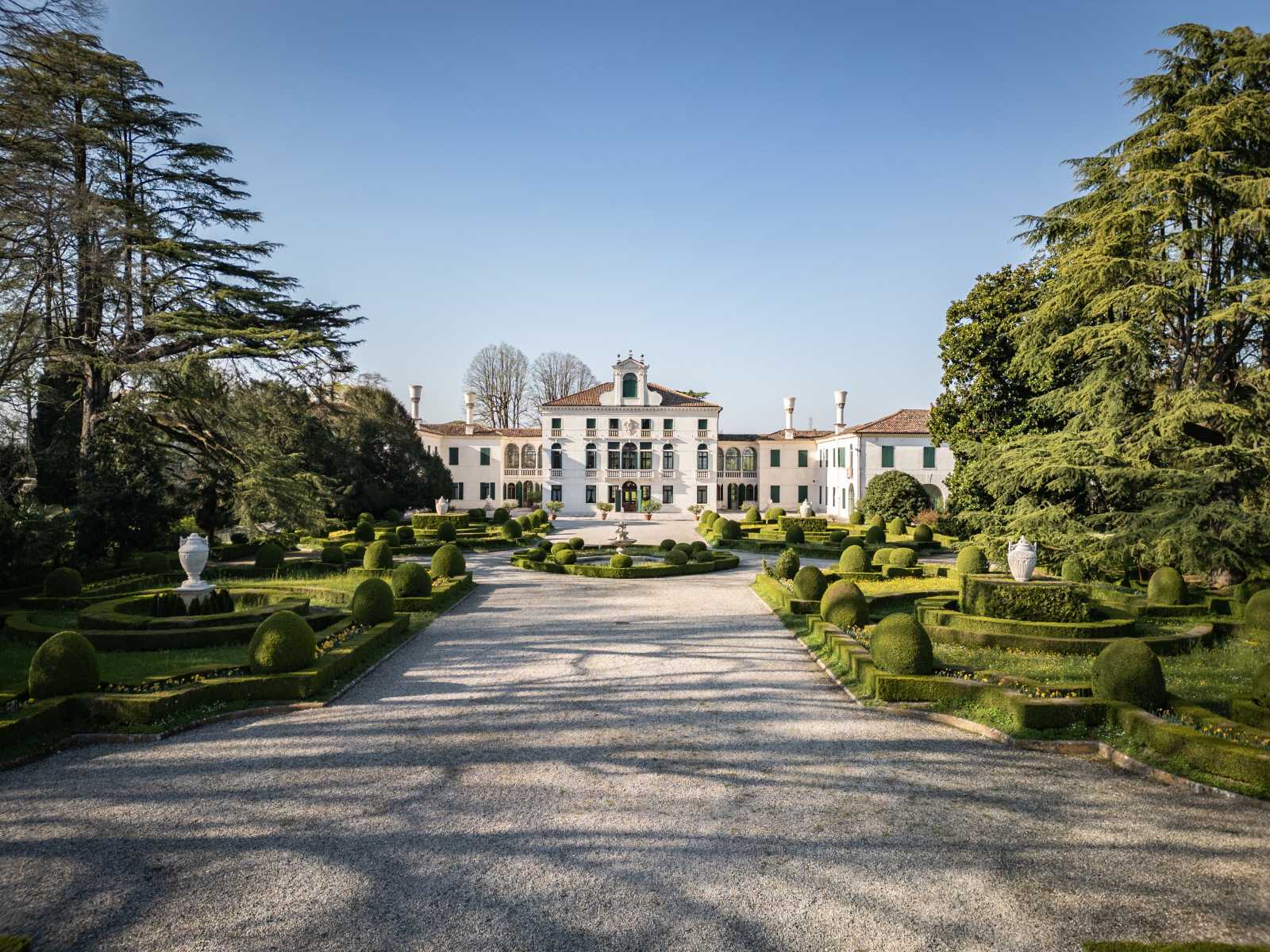 Partendo dalla facciata nobile della Villa, troviamo il “selese” (selciato) ornato da busti del Bernardi, i filosofi Democrito ed Eraclito, detti il filosofo che ride e il filosofo che piange, che traguardano il sole che nasce e tramonta nel giorno del solstizio d’inverno, una data fondamentale per indicare la fine e l’inizio della stagione agraria. Dal “selese” si accede al giardino all’italiana con fontana al centro e vasi ornamentali e aiuole di forme mistilinee delimitate da siepi di bosso nano e punteggiate da bosso sagomato a sfera e a pigna. Ai lati del giardino formale si estende il parco romantico all’inglese, con viali, montagnole, grotte, due serre, vasi ornamentali e piante secolari.