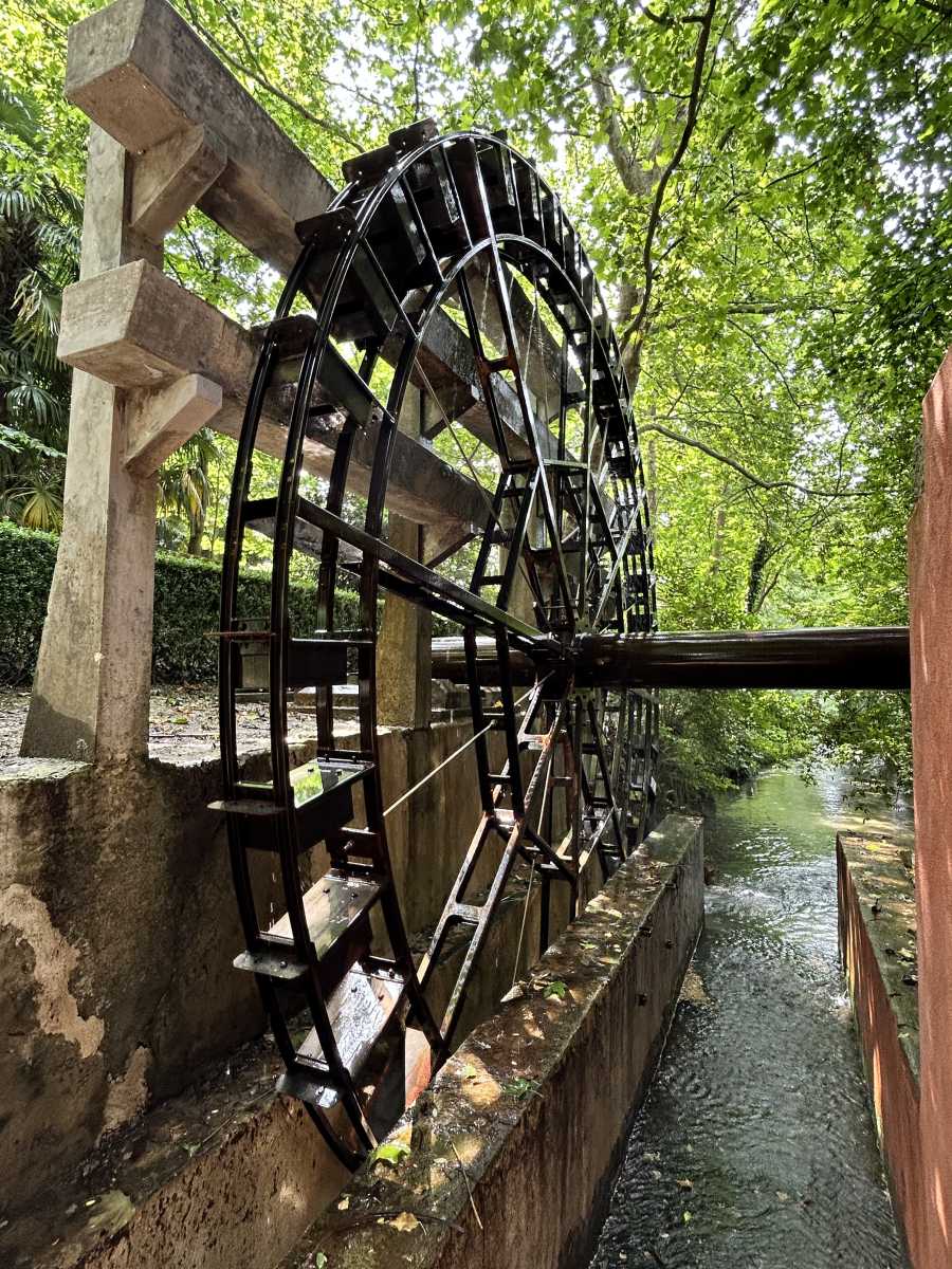 Una grande ruota d‘acqua di cinque metri e mezzo di diametro alimenta il sistema d‘irrigazione del parco, che originariamente generava uno stagno sull’apice di una collinetta e una cascatella per la produzione invernale del ghiaccio, da conservare nella grotta adibita a ghiacciaia. C‘era anche un piccolo lago che fungeva da riserva d’acqua per le coltivazioni orticole e frutticole del brolo della Villa.
